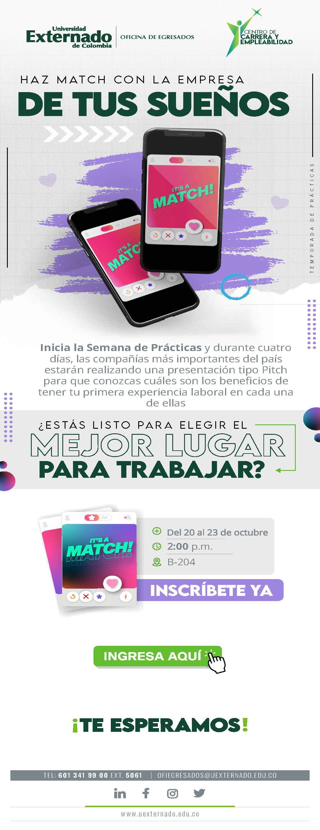 👉 Recuerda: más del 80% de nuestras(os) externadistas encuentran sus prácticas gracias a este encuentro. Además, algunas empresas ofrecen pasantías internacionales, modalidades híbridas o virtuales, cursos gratuitos e incentivos académicos o monetarios.